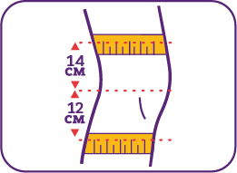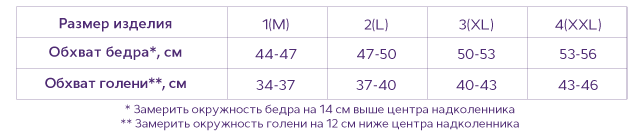 Для подбора размера следует измерить окружность бедра на 14 см. выше центра надколенника и окружность голени на 12 см. ниже центра надколенника.