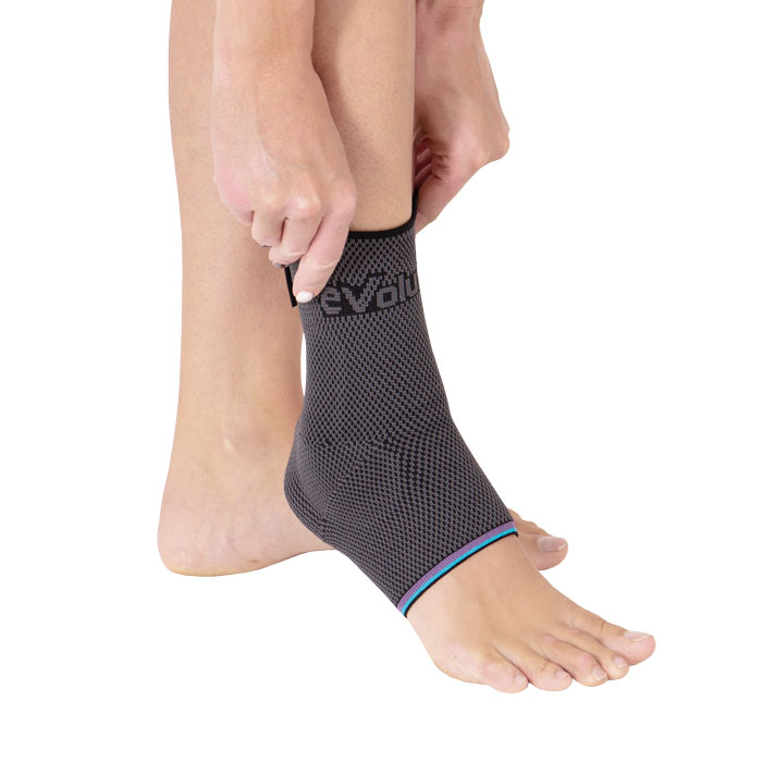 Вывернуть верхнюю часть бандажа наружу, до силиконовых пелотов. Взять бандаж за середину, натянуть на стопу как носок. Силиконовые пелоты должны окружать лодыжки. Развернуть верхнюю часть бандажа, подтянуть и расправить его.